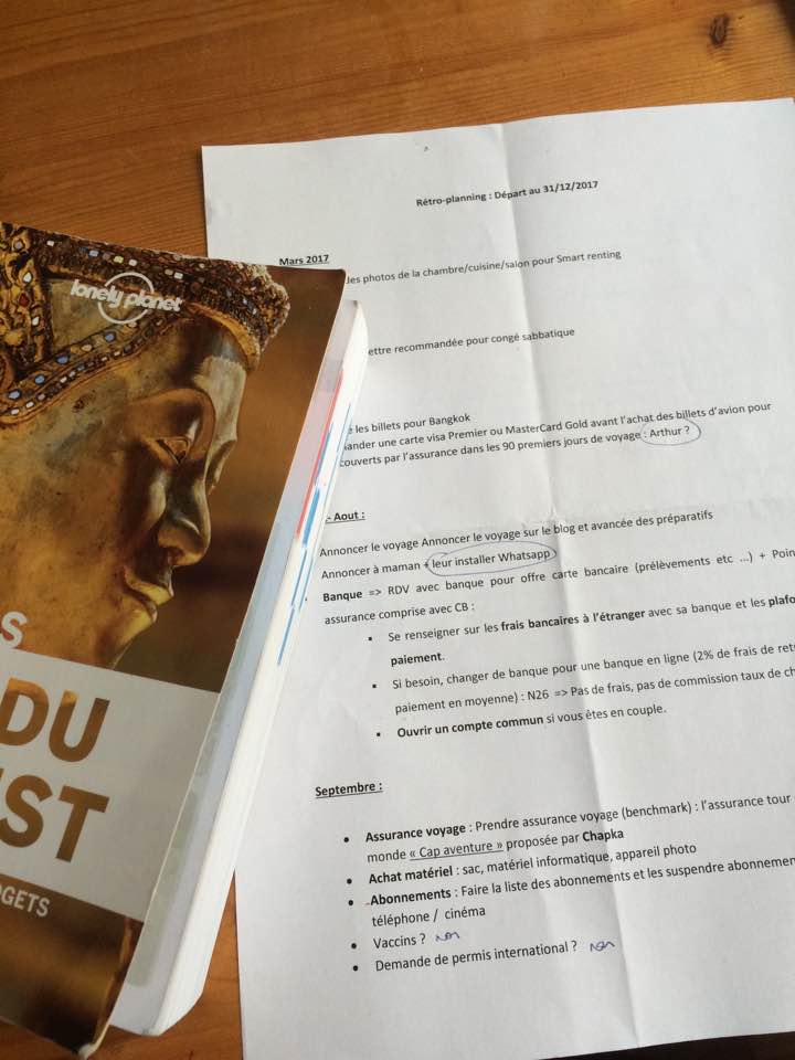 Sachant que nous sommes propriétaires du logement, il n’était pas question de déménager. Nous ne souhaitions pas non plus démissionner de nos jobs, et avons opté pour un congé, ce qui est tout à fait courant dans notre entreprise et ne pose pas de souci. Le reste du planning relève de considérations indispensables comme l’assurance voyage et d’autres plus personnelles, comme la tenue d’un blog.