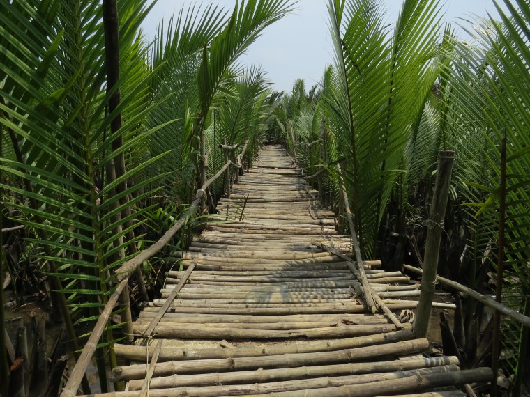 Nous nous sommes rendus aux deux entrées d’un grand pont de bambou, permettant l’accès à ce qui était noté comme la « Water Coconut forest » mais l’endroit semble fermé voir abandonné, et on a jamais trouvé où il aurait fallu acheter les billets … Tentez plutôt votre chance sur l’île de Cam Thanh pour visiter le coconut water village.