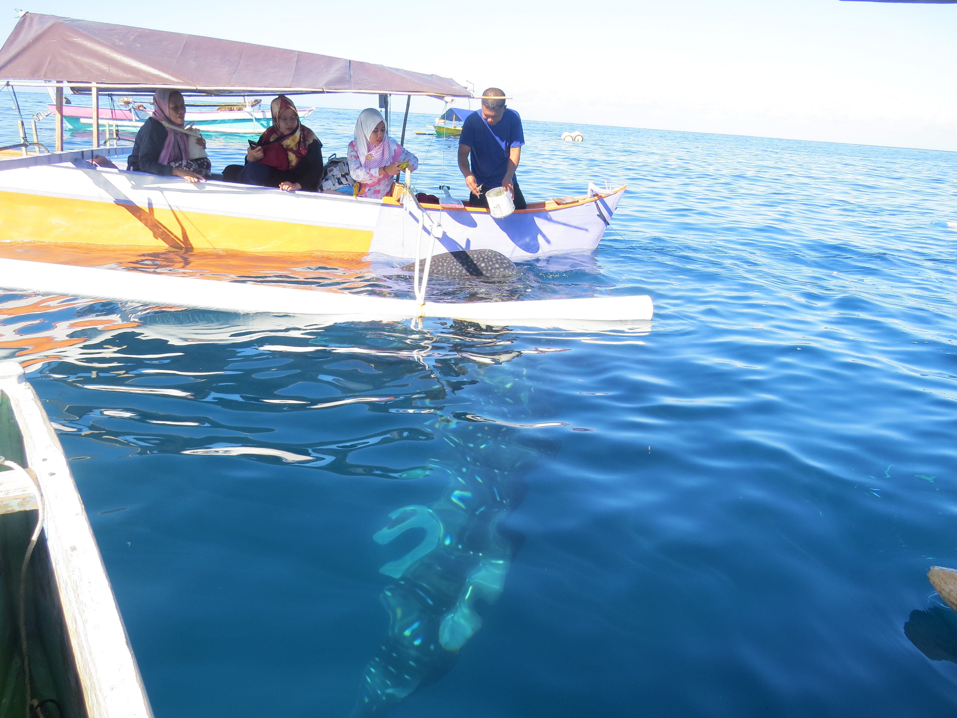 Il faut savoir que la plupart des touristes sont des Indonésiens. Ils restent généralement sur le bateau, sauf les plus jeunes, et les organisateurs de ces tours leur donne des déchets de crevettes pour attirer les requins baleines. Quand nous avons vu ça, alors qu’une affiche stipulait bien qu’il ne fallait pas nourrir ces créatures, nous avons été très déçus. Chaque boatman essayant d’attirer les animaux pour le plaisir de leurs passagers.