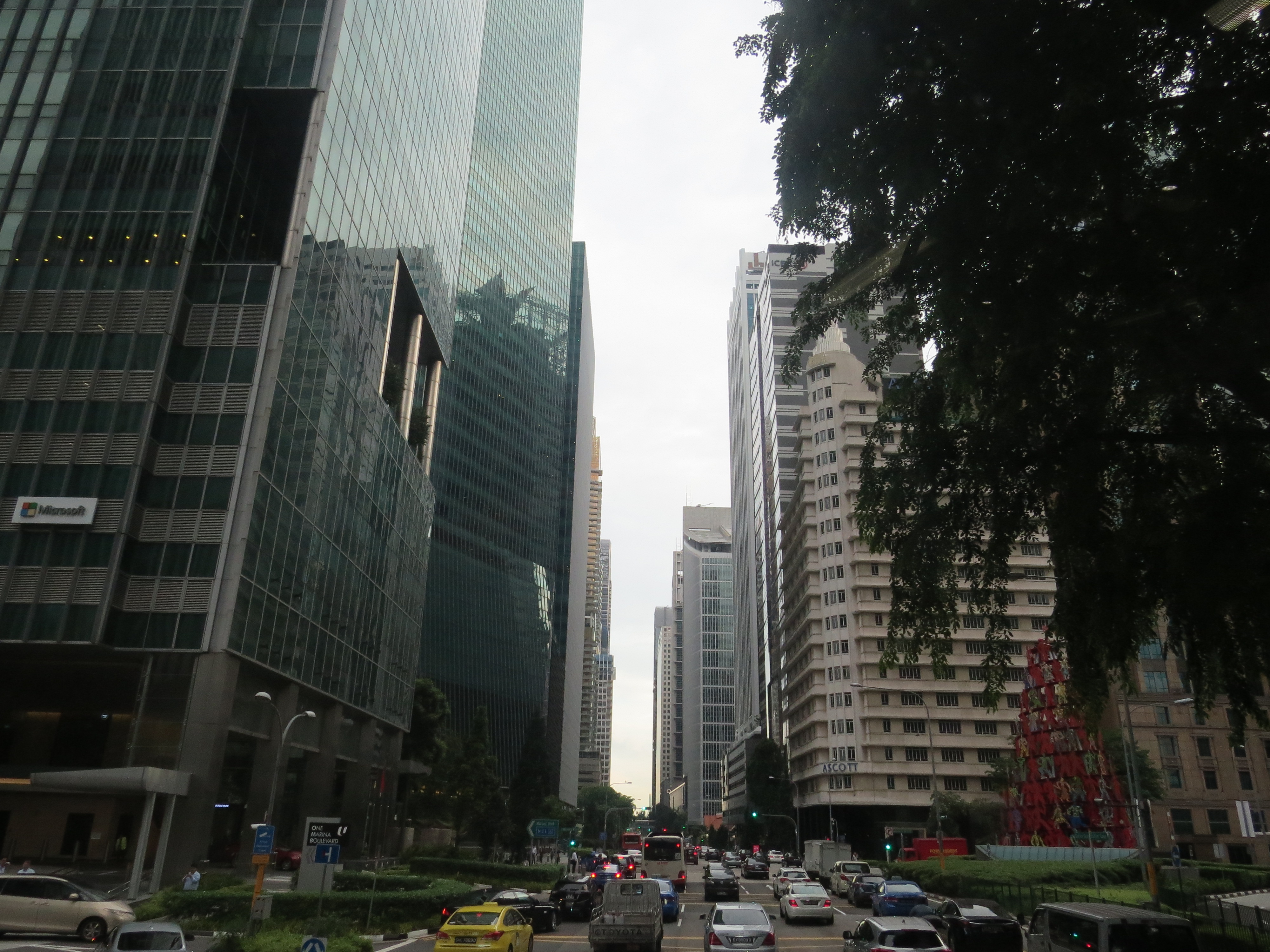 Nous sommes montés dans un bus à deux étages en prenant bien le soin de nous mettre tout devant. Voilà un excellent moyen de visiter Singapour avec un simple pass transport. Et voilà que nous avons vu surgir devant nous le quartier des affaires et ses tours géantes.